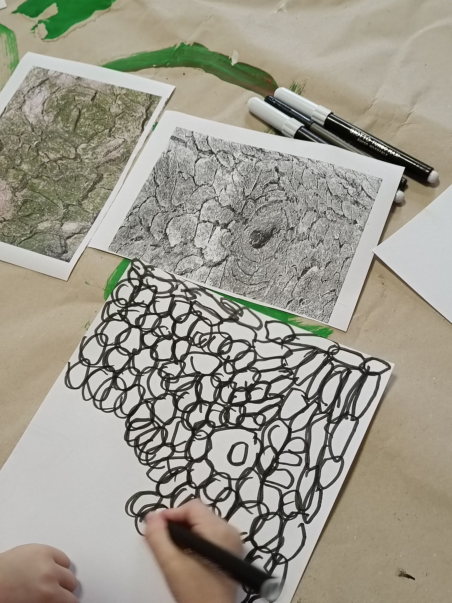 L’osservazione si è trasformata in esperienza grafica: su fogli e materiali diversi, i piccoli hanno rielaborato le trame scoperte, dando forma ai propri pensieri attraverso segni personali e creativi.